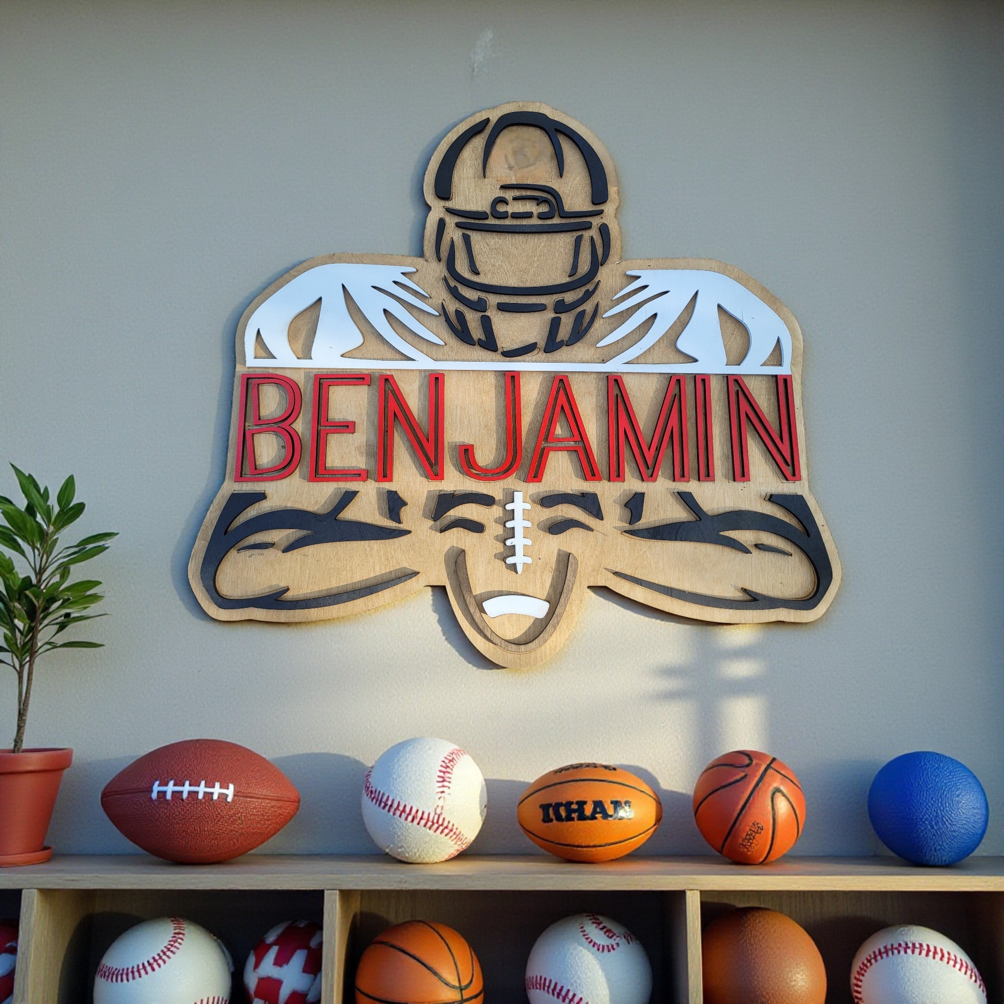 Personalized boys room sign featuring custom name lettering in your choice of colors or team themes. This versatile 24" wooden sign works beautifully in bedrooms, sports areas, garages, and media rooms. Contact us to design your perfect sign—we'll customize colors, sizing, and styling to match your space. Available in alternative dimensions to suit any wall. An ideal gift for young sports enthusiasts or a standout accent piece for any boy's room.