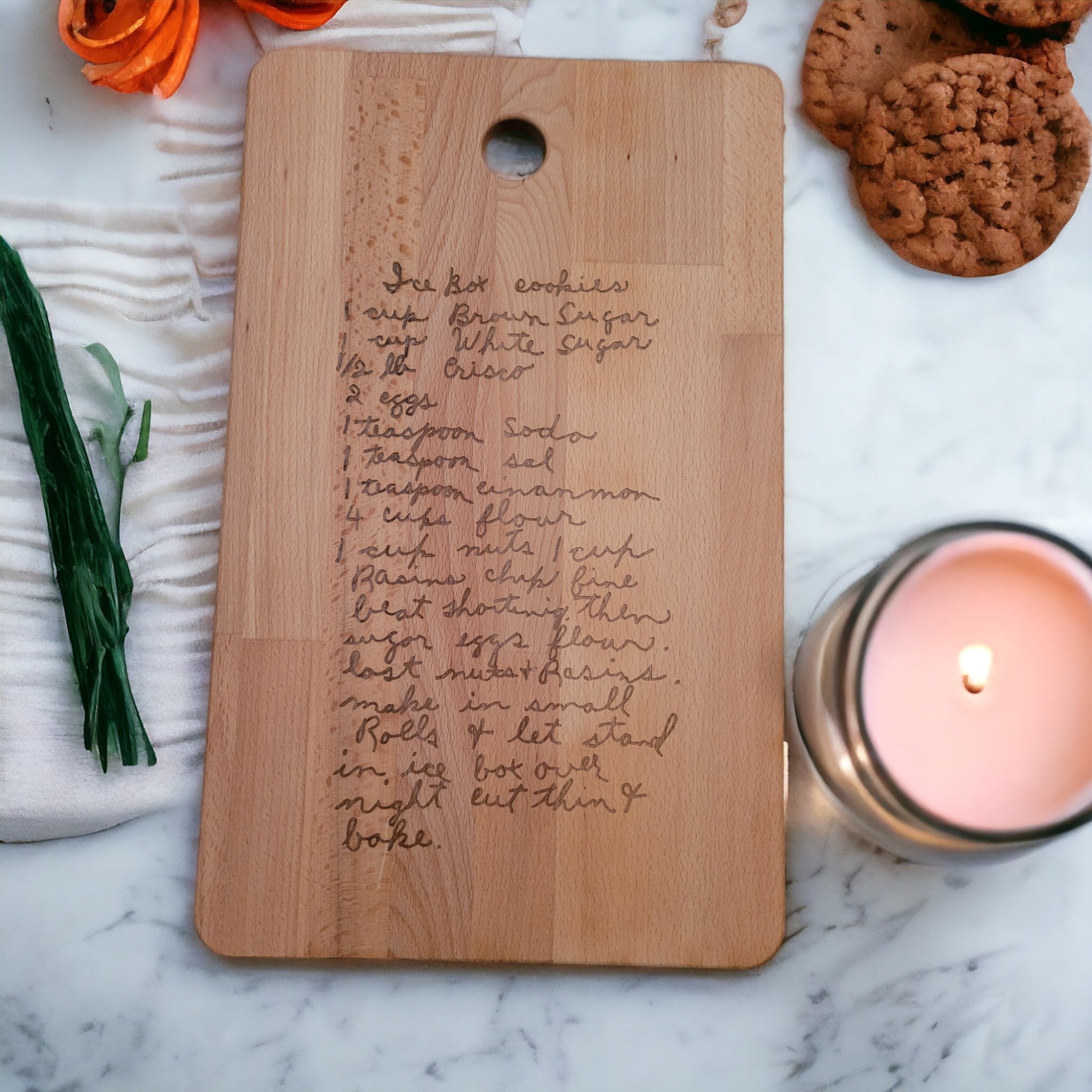 Transform your cherished family recipes into timeless heirlooms with our custom cutting board. Simply scan or photograph the handwritten recipe, and we’ll expertly engrave it onto high-quality wood. Here are the details: