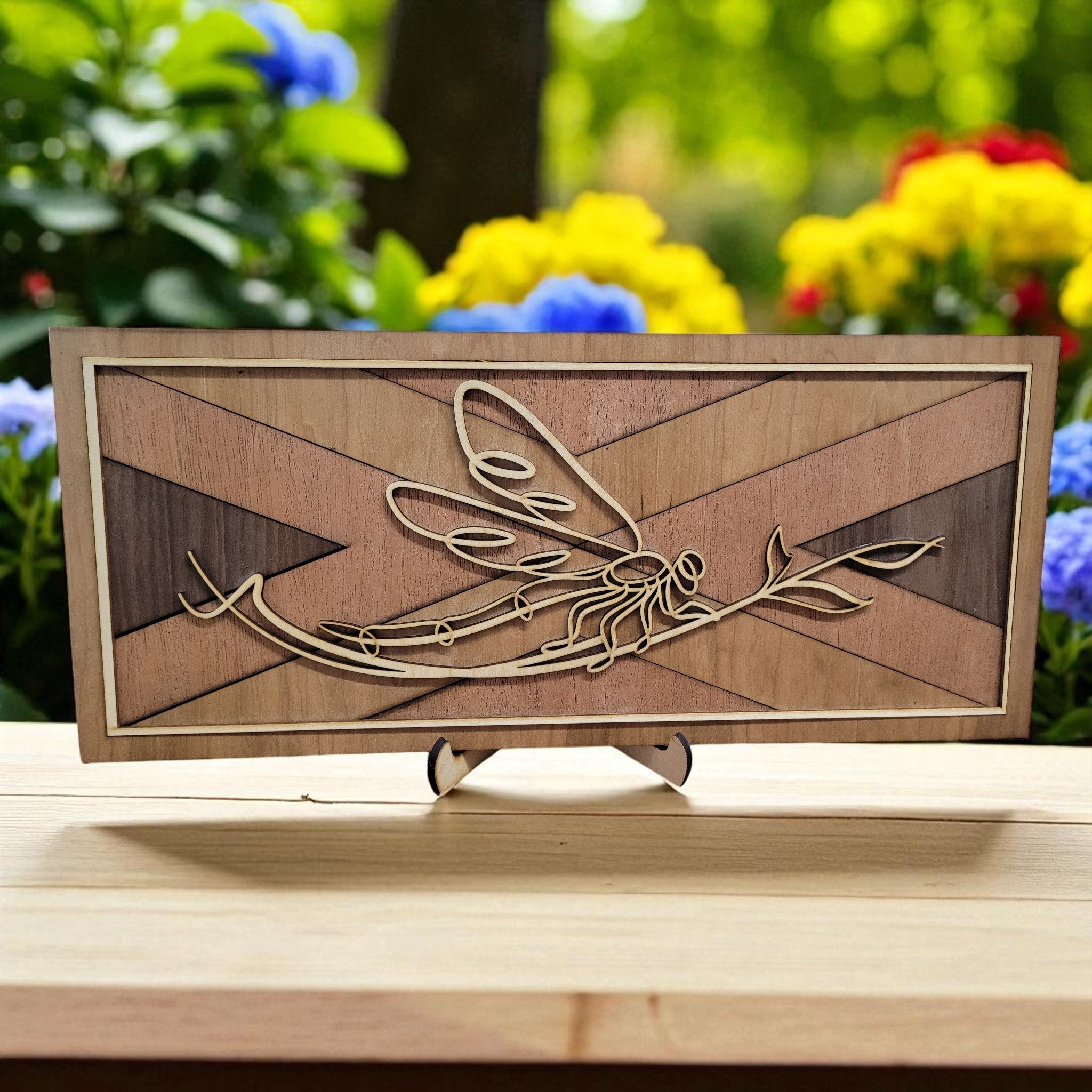 Crafted from quality wood, this 18.5" x 8" decor piece features a delicate dragonfly rendered in elegant line art against a modern geometric background. Designed for versatility, it can be displayed by hanging on a wall or placed on an easel, making it a refined addition to any space seeking a blend of natural inspiration and contemporary style.