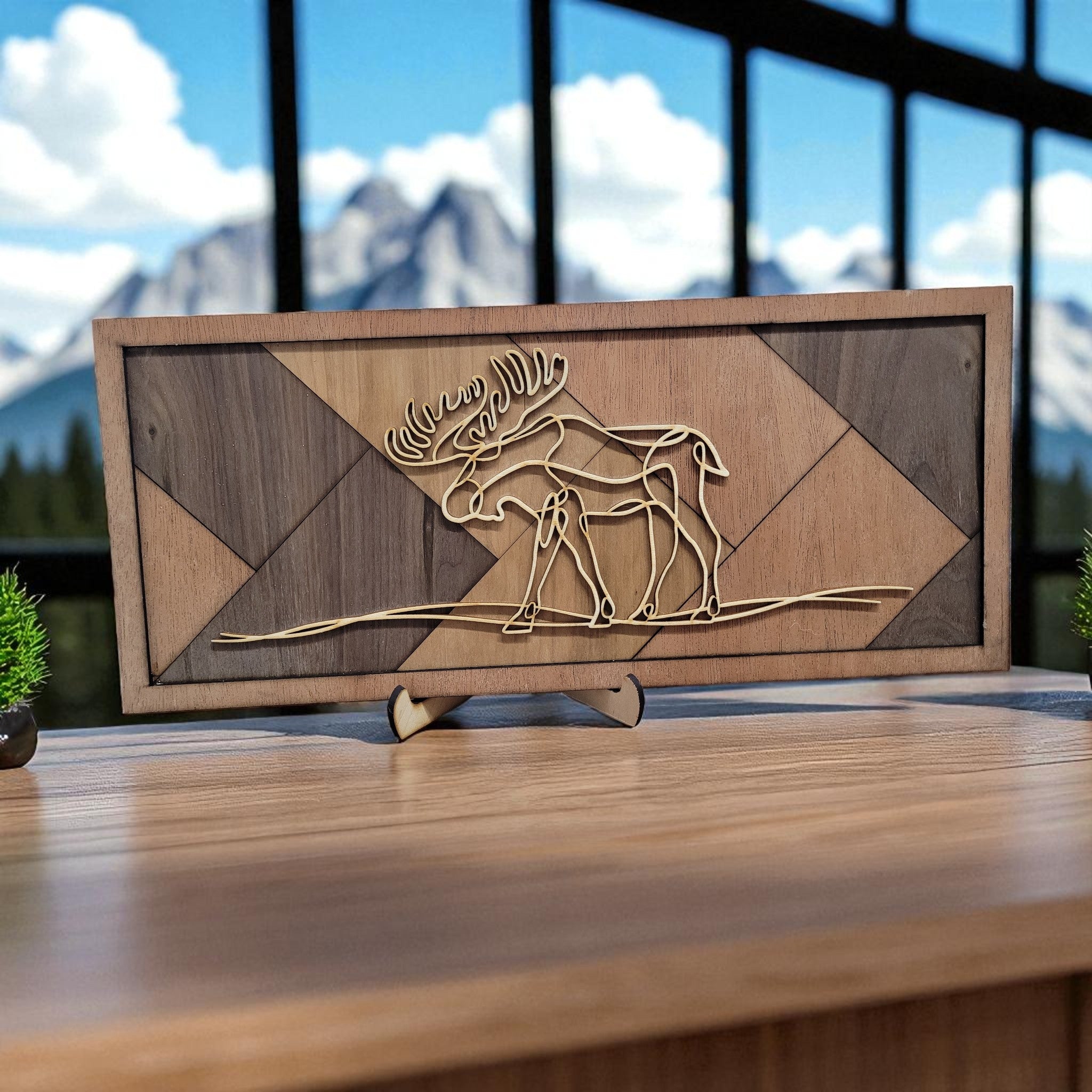 Crafted with precision, the Mighty Moose Line Art features a striking moose silhouette set against a modern geometric background. Measuring 18.5" by 8", this wood decor piece offers versatile display options—hang it on your wall or showcase it on an easel. Its clean lines and natural wood finish bring a sophisticated, rustic touch to any space, making it an ideal choice for those seeking expert-level design in wildlife-inspired home accents.