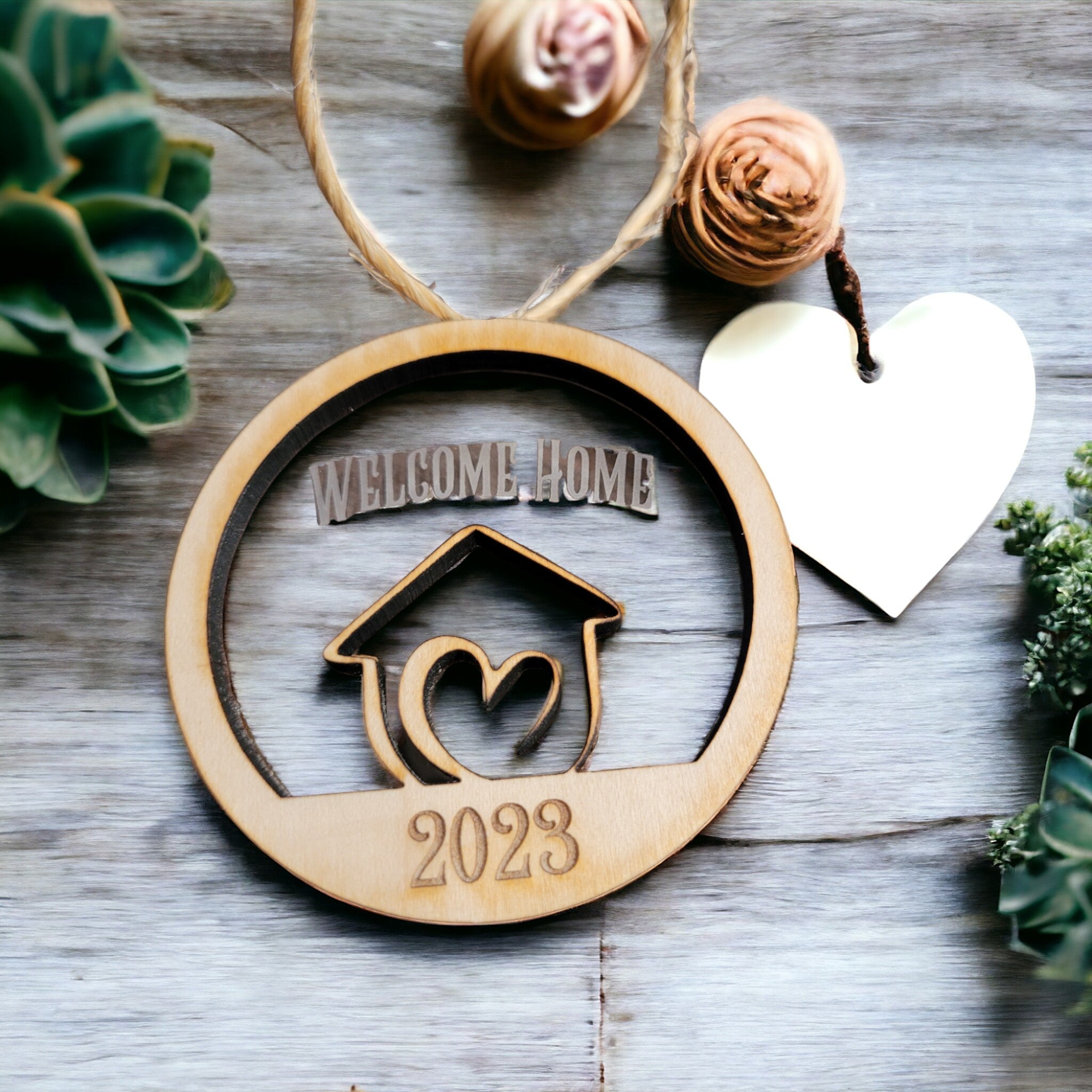 Simple Welcome Home ornament, can be engraved with custom message. Crafted from natural wood and clear acrylic, this piece features: